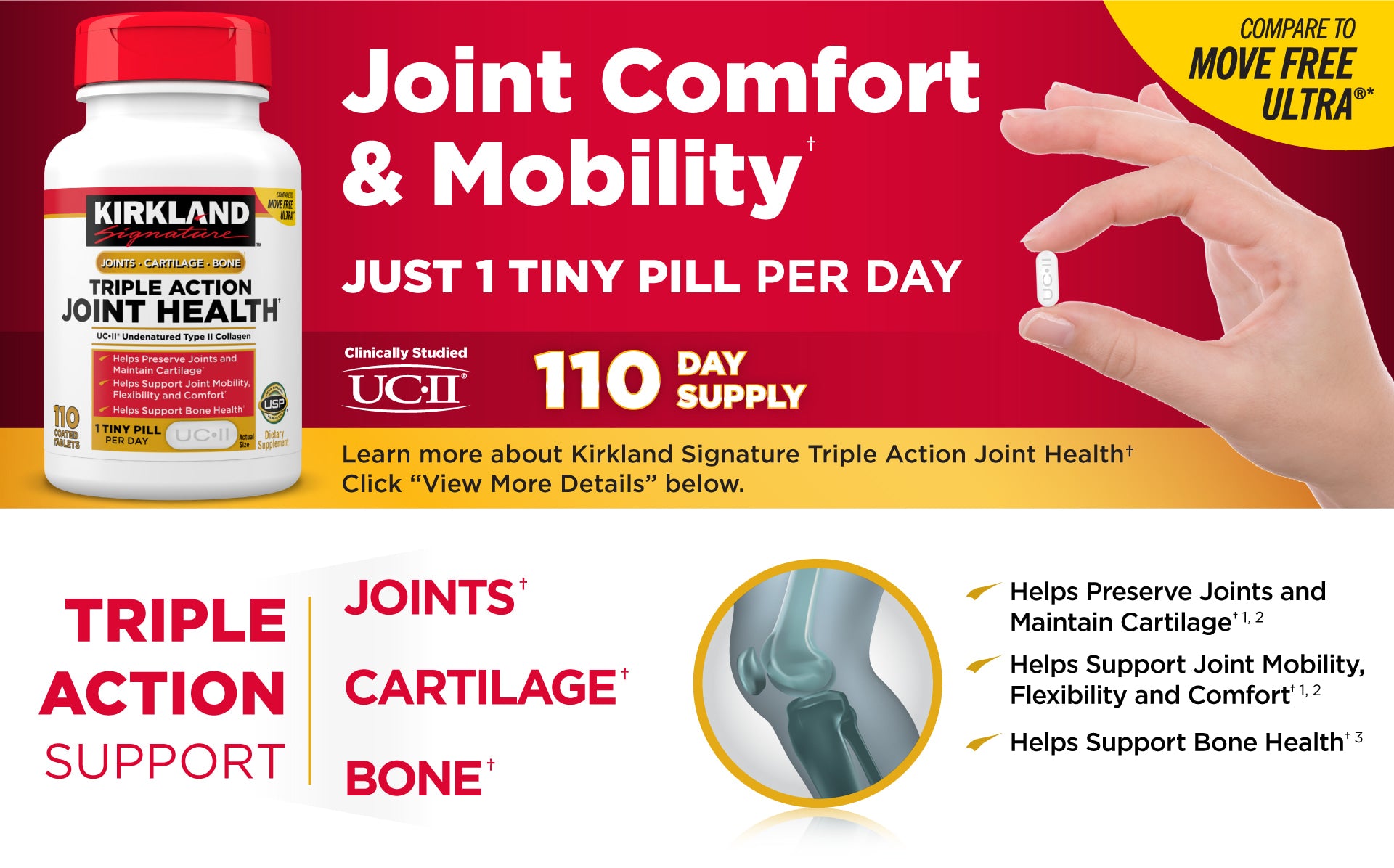 Well now, just one tiny tablet daily is all you need and the benefits are even better with Kirkland Signature Triple Action Joint Health, powered by UC•II®.†