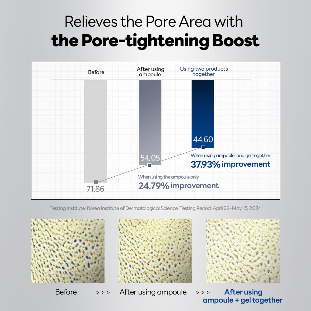 - [2-Step solution for pore size improvement and extraordinary absorption] - Visible pore care effect with single usage and significant effect with 2-step solution.(15% of pore shrinking effect with ampoule only, 29% of effect with ampoule & gel mask)