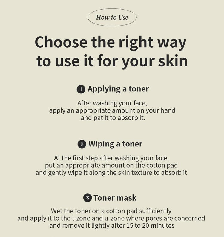 Wiping a toner Take a moderate amount on cotton pads and wipe following your skin texture |