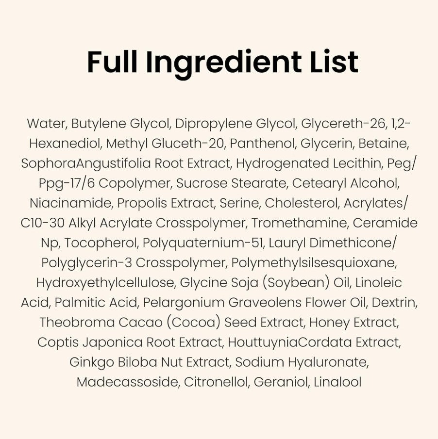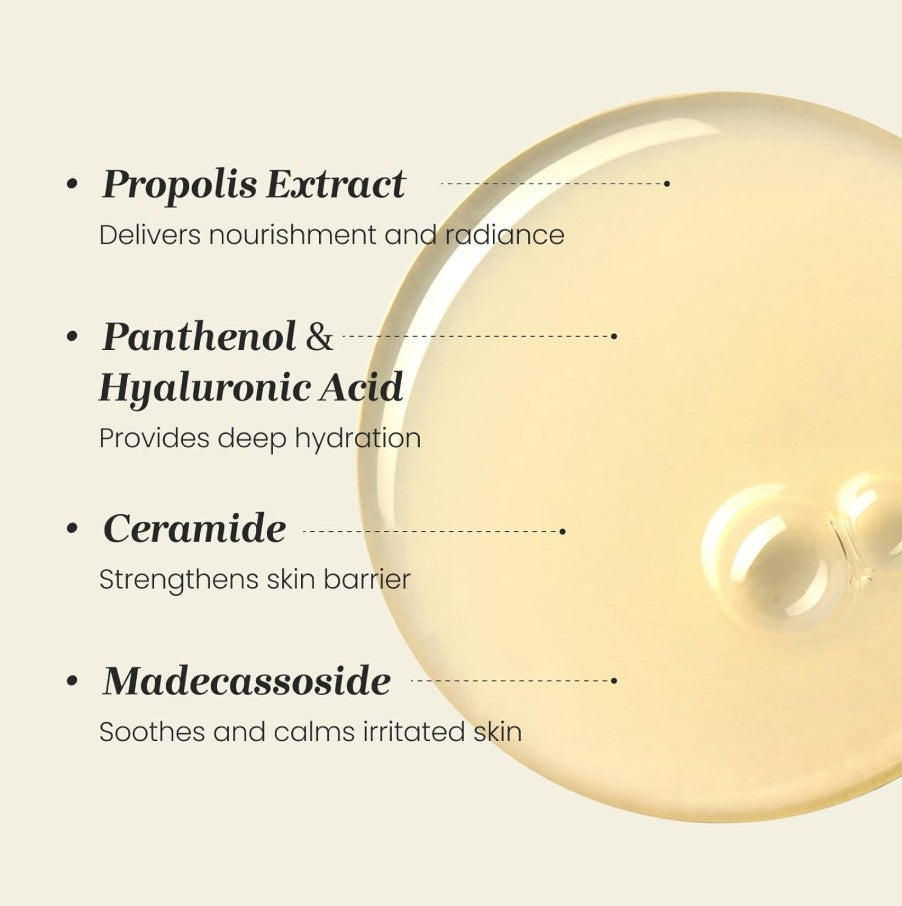 [KEY INGREDIENTS] Formulated with 1,000 ppm propolis extract, effective in soothing and nourishing the skin. Also infused with amino acids and ceramides for hydrating care, and madecassoside for soothing care.