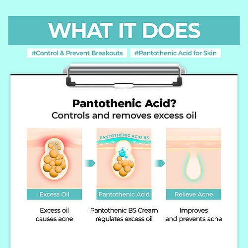 [PANTOTHENIC ACID] Pantothenic acid is a well-known supplement for acne, reducing inflammation and regulating excess oil production, which can lead to clogged pores and cause breakouts and acne. Pantothenic acid-enriched skincare products offer a safer alternative to oral supplements in preventing and reducing acne and breakouts.
