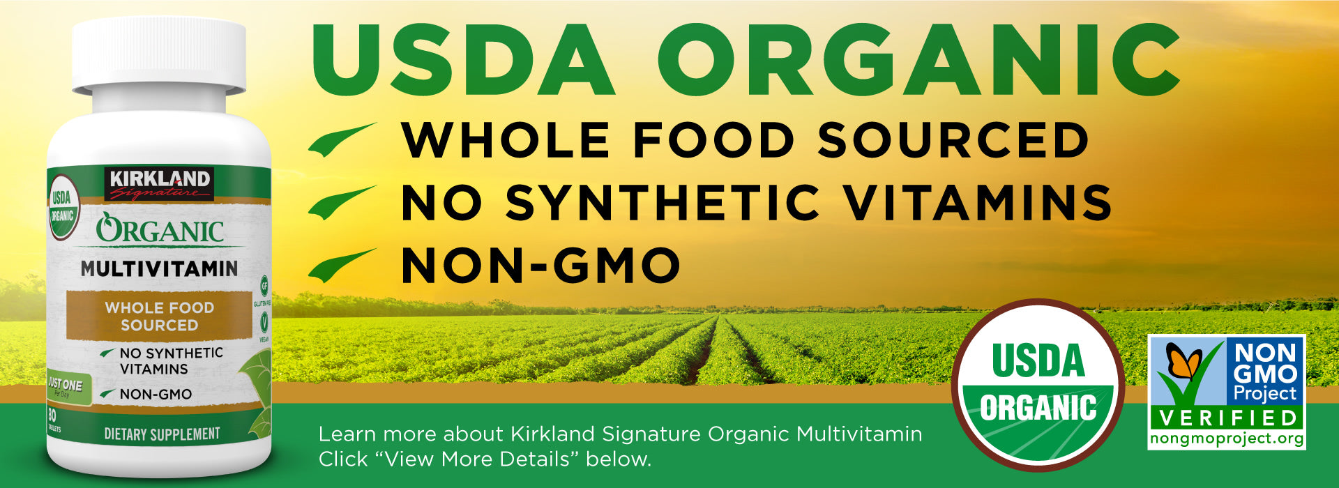 Kirkland Signature Organic Multivitamin is a complete formula with 19 vitamins and minerals. It is USDA certified organic and Non-GMO Project Verified. It is vegan, gluten free, and has no synthetic vitamins or artificial colors, flavors or preservatives. Whole food sourced, plant based and organic — nutrition as nature intended.