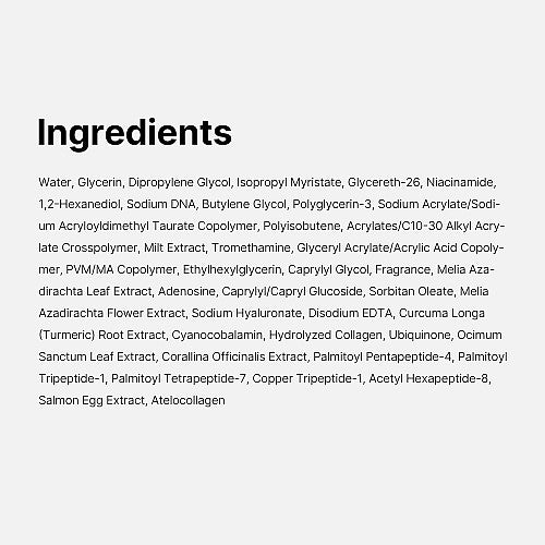 KEY INGREDIENTS: Containing SALMON PDRN, five types of peptide complex, niacinamide, adenosine, and Ocimum Sanctum (Holy Basil) leaf extract, this formula provides effective care for uneven skin tone and elasticity.