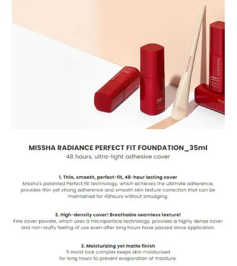 Indulge in exquisite, long-lasting coverage with MISSHA Radiance Perfect Fit Foundation.