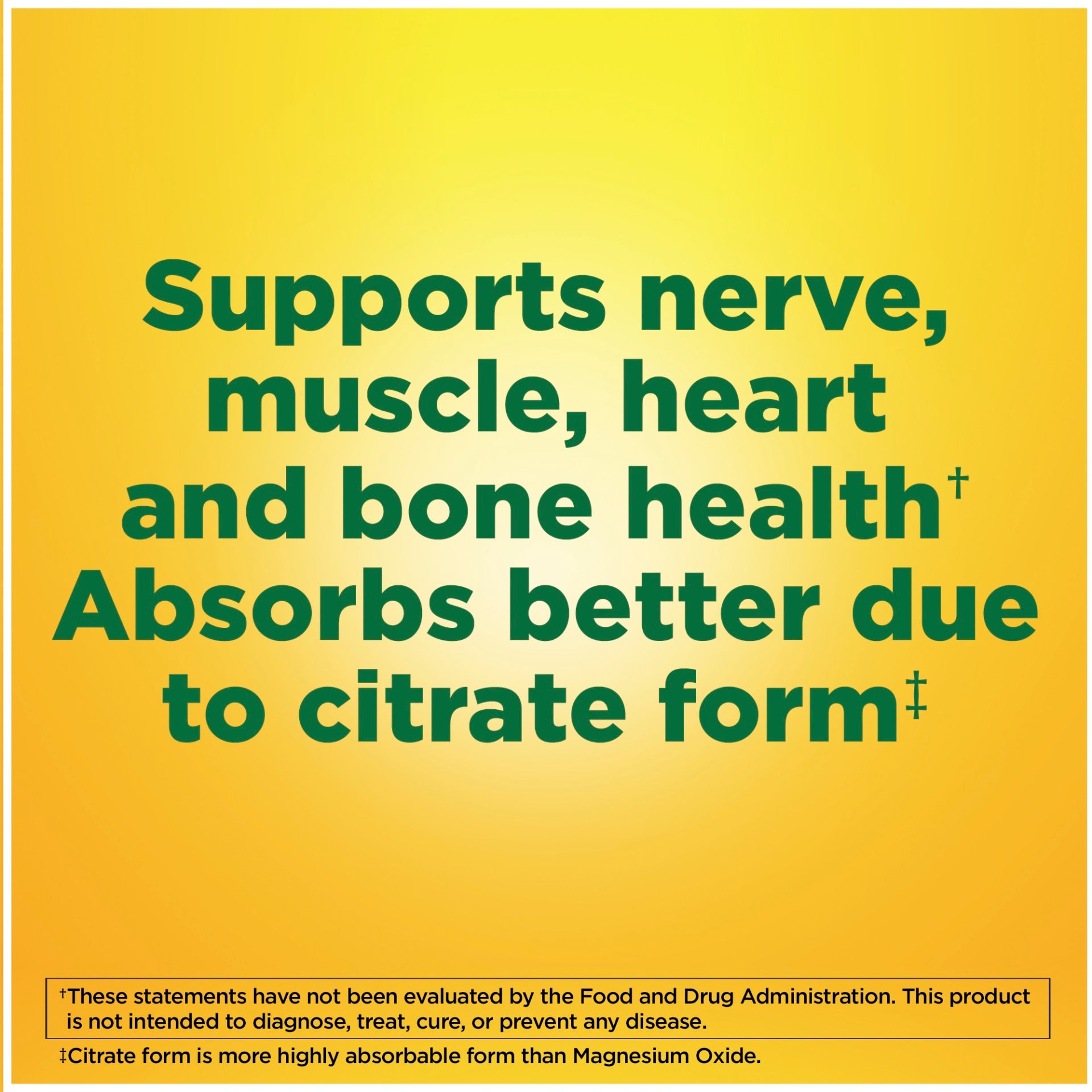Nature Made® Magnesium Citrate is 100% magnesium citrate, a highly absorbable form of magnesium‡, to help meet daily needs for this essential nutrient. Information from The National Health and Nutrition Examination Survey (NHANES) shows that 55% of the US population has inadequate dietary intake of magnesium.1 Magnesium participates in more than 300 reactions in the body and is critical to many bodily functions such as helping to support nerve, heart, and muscle function, healthy bones and teeth, and assisting with converting carbohydrates, protein, and fat into cellular energy.2,3†