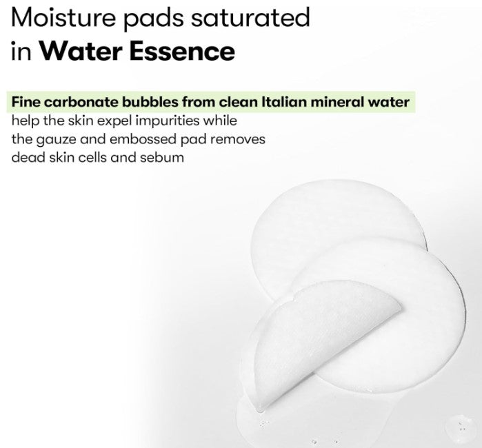 Fine carbonate bubbles from Italian mineral water help the skin expel impurities while the gauze-embossed pad gently removes dead skin cells for a smooth and softer skin texture.