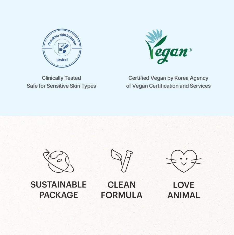 [CLEAN BEAUTY] Our goal is to pursue clean, safe, and sustainable beauty for the future, and so we made our products certified VEGAN and use FSC Certified packaging. All of our products include no animal-derived ingredients or animal testing (cruelty-free).