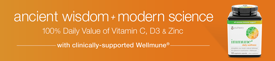 Youtheory® Immune+ Daily Wellness provides 100% Daily Value of vitamin C, D3 and zinc. It also harnesses the power of medicinal mushrooms and clinically studied Wellmune® to help strengthen the body’s immune response.* This daily wellness formula naturally primes the immune system to prepare and protect the body against daily stressors and environmental challenges.* For best results, use daily to help maintain immune readiness throughout the year.*